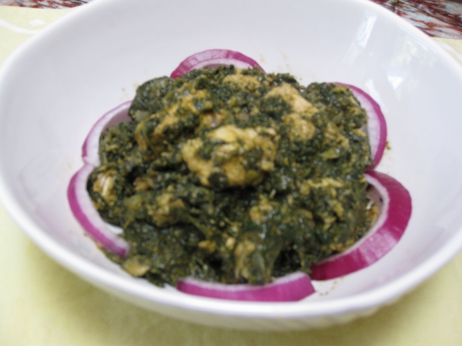 The garlic paste. Stir it and add the chicken and spices that are mixed together. Stir for couple of minutes till they start becoming brownish. Add the grated spinach and mix well. Add one cup of water and mix again. Cook it stirring occasionally till it starts boiling. Lower the heat to lowest and cover the pan. Cook it on lowest heat for 20 minutes. Open the lid and stir it well. Put it in the serving dish and garnish with onion rings as shown in the picture. You may garnish it with slices of tomato as well. Serve with plain rice or with your choice of bread (preferably Naan).